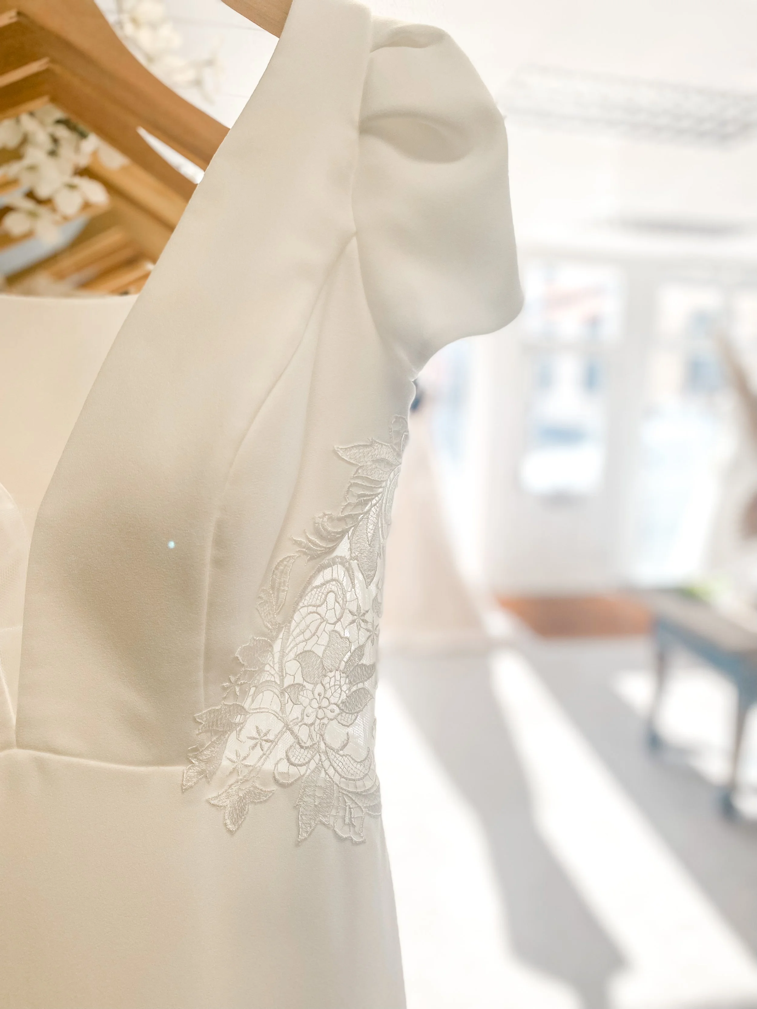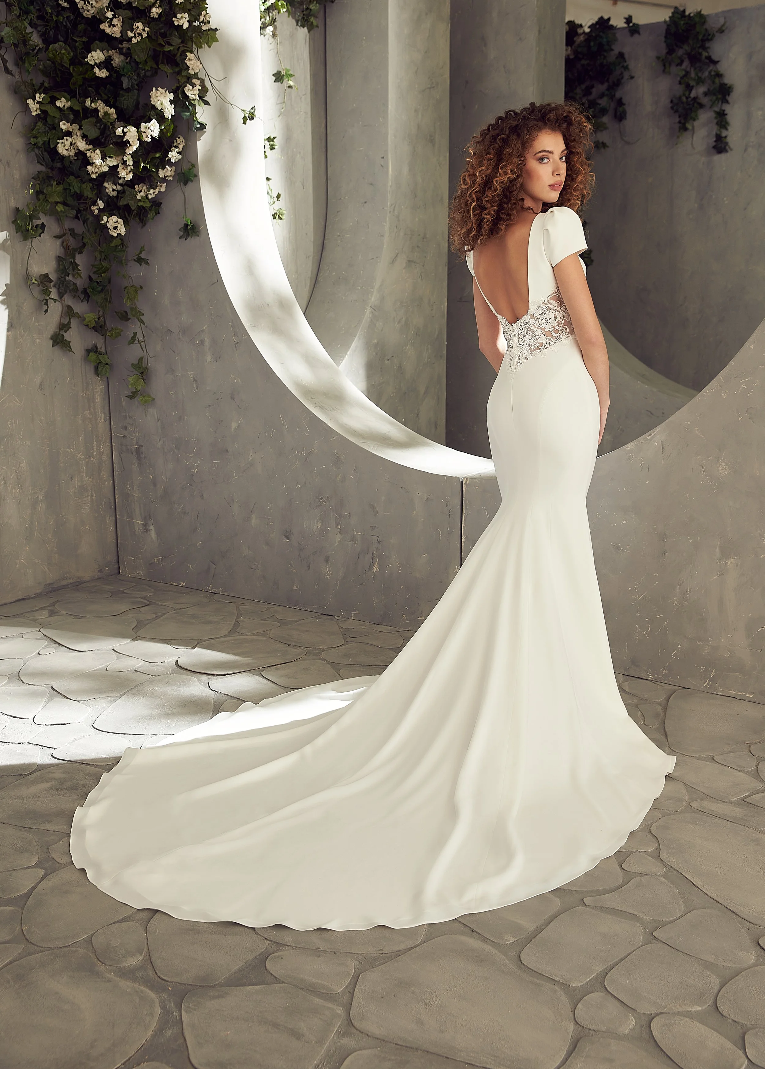 Puff sleeve gorgeousness ( but not the 80βs kindβ¦) I love how the lace insets on the waist work to create a beautiful hour glass shape and then follow round to the back to create a wonderful sexy silhouette with the seamed fit and flare skirt. This is a confident modern gown that would work perfectly for a chic, luxe wedding.