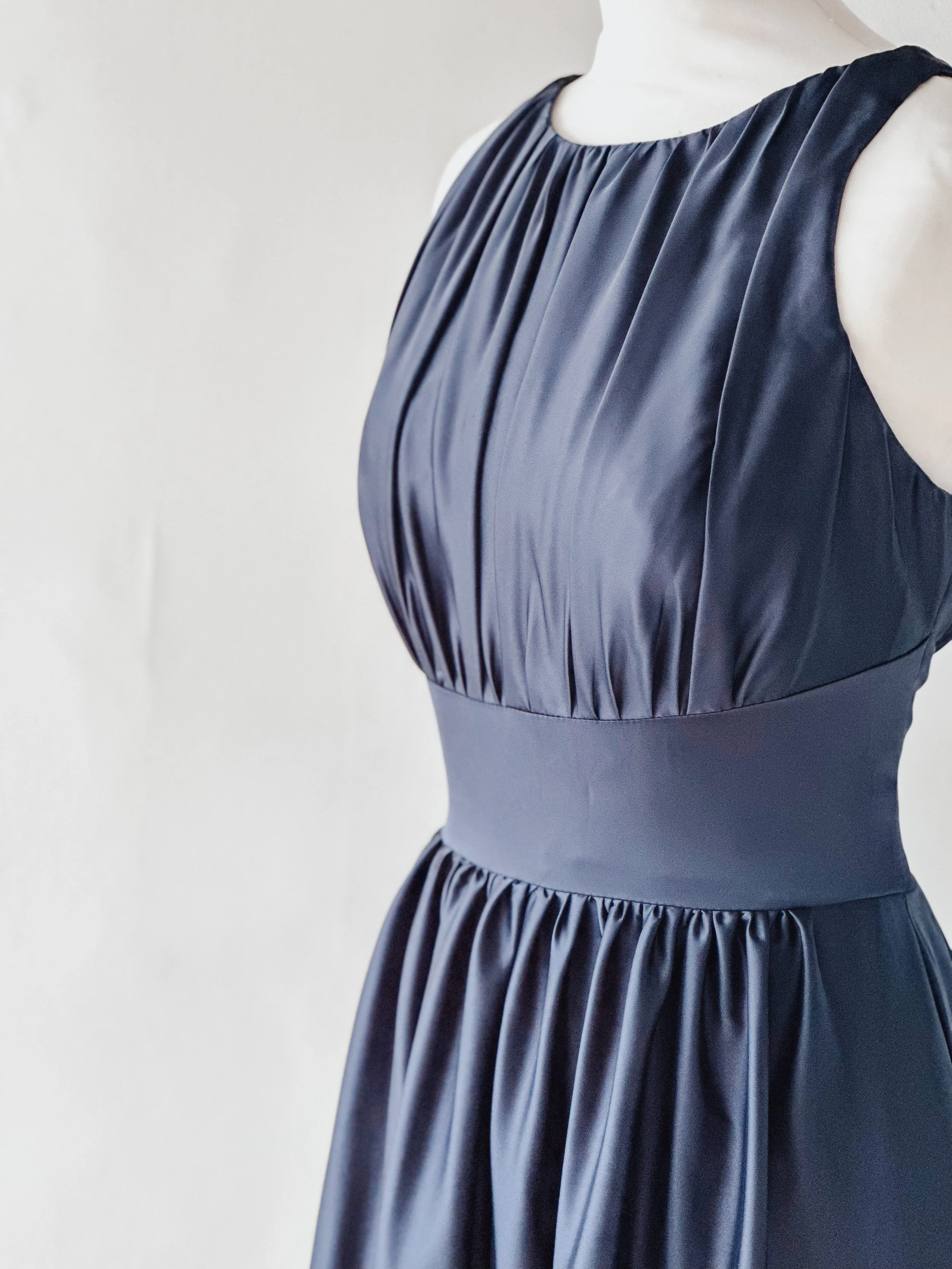 Simple, elegant styling for bridesmaids who feel more comfortable in a high neckline. Berta has a gorgeous pleated bodice with a defined waistband and softly gathered skirt. The ultimate in comfortable styling. The back is equally as stunning with its tie top and fabulous key hole back.