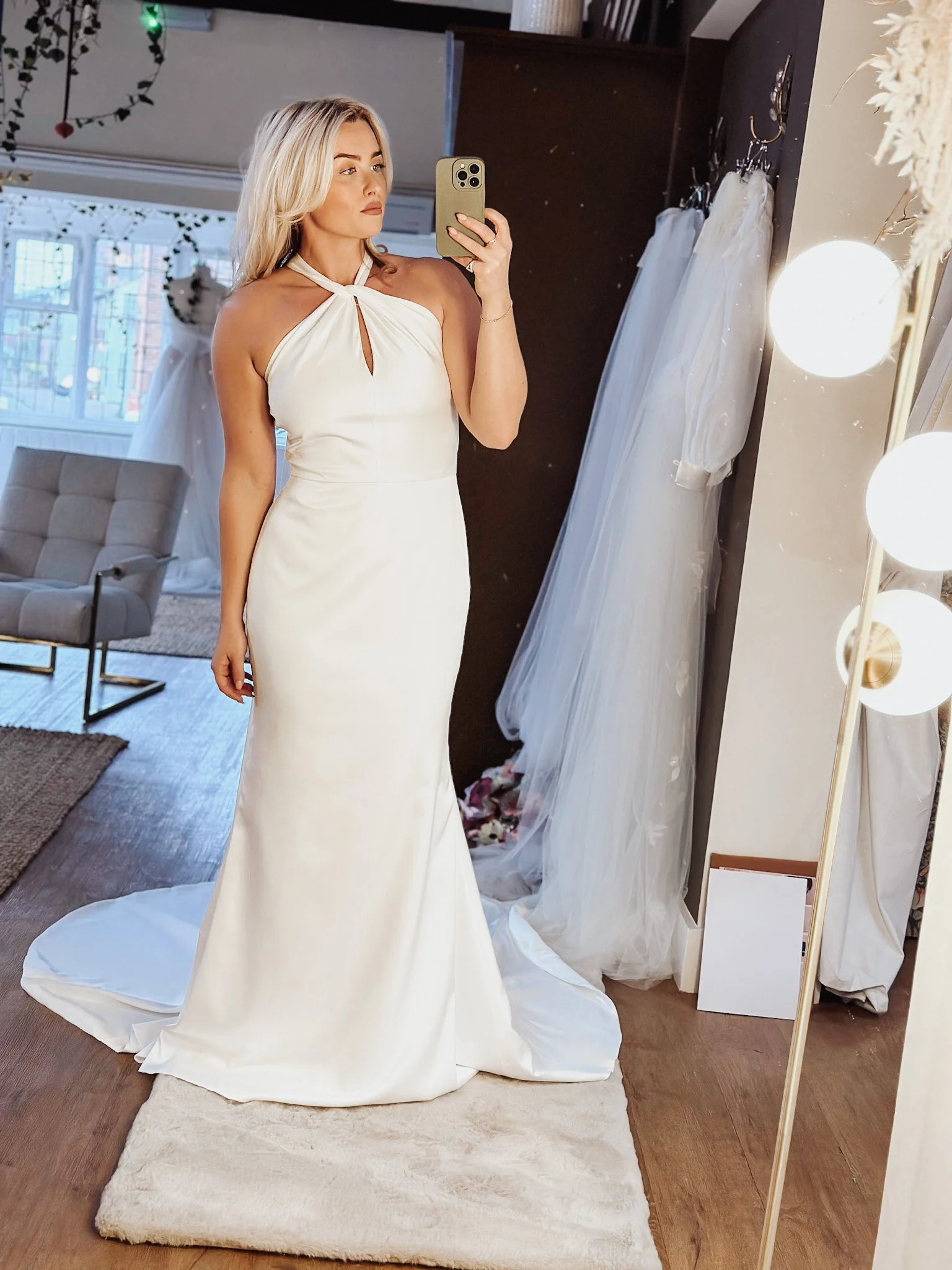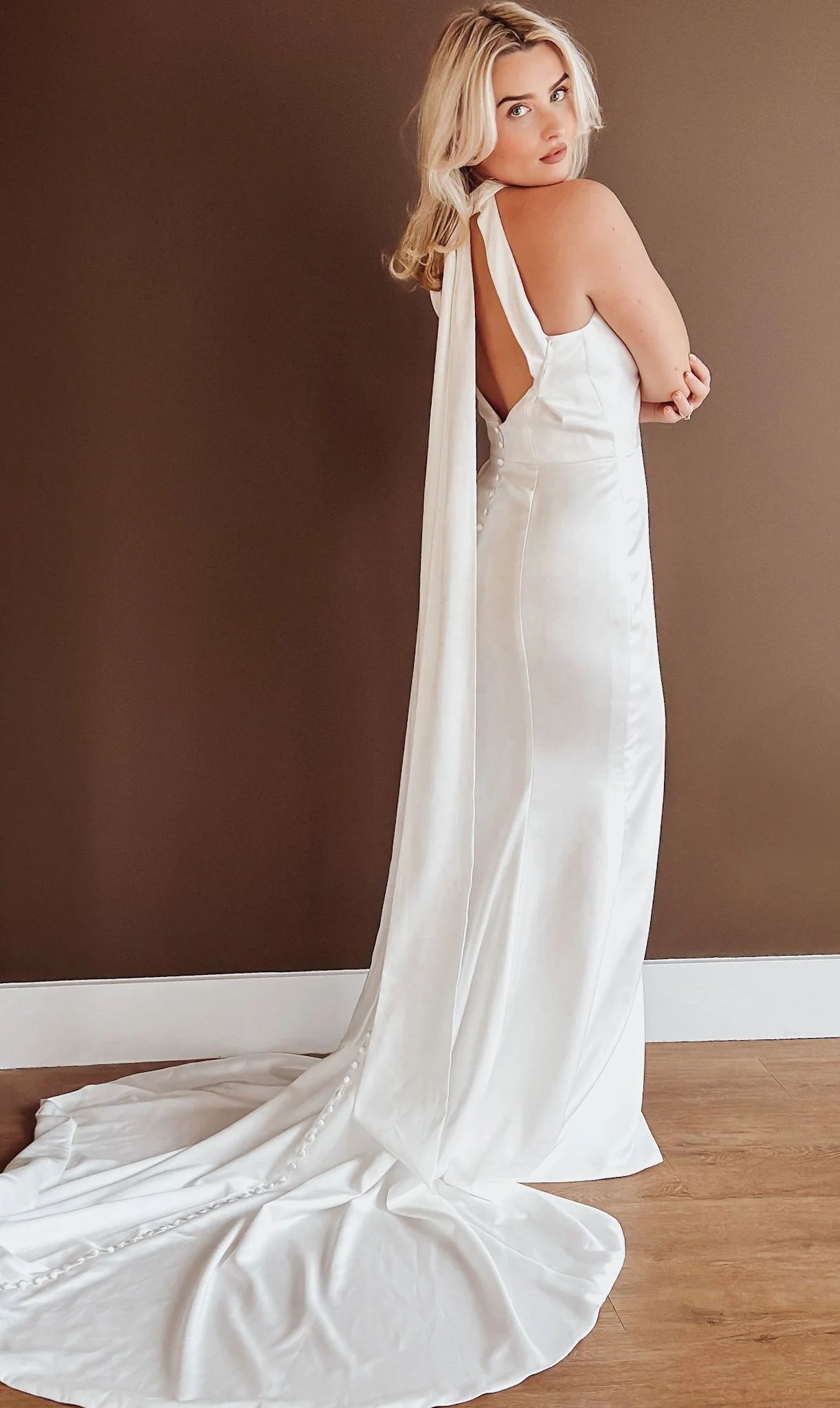 Satin unstructured gown with twist neckline and feature back. Minimal styling with luxury feel of satin next to your skin. Ideal for a twilight ceremony or for the bride who wants the WOW but not traditional.
