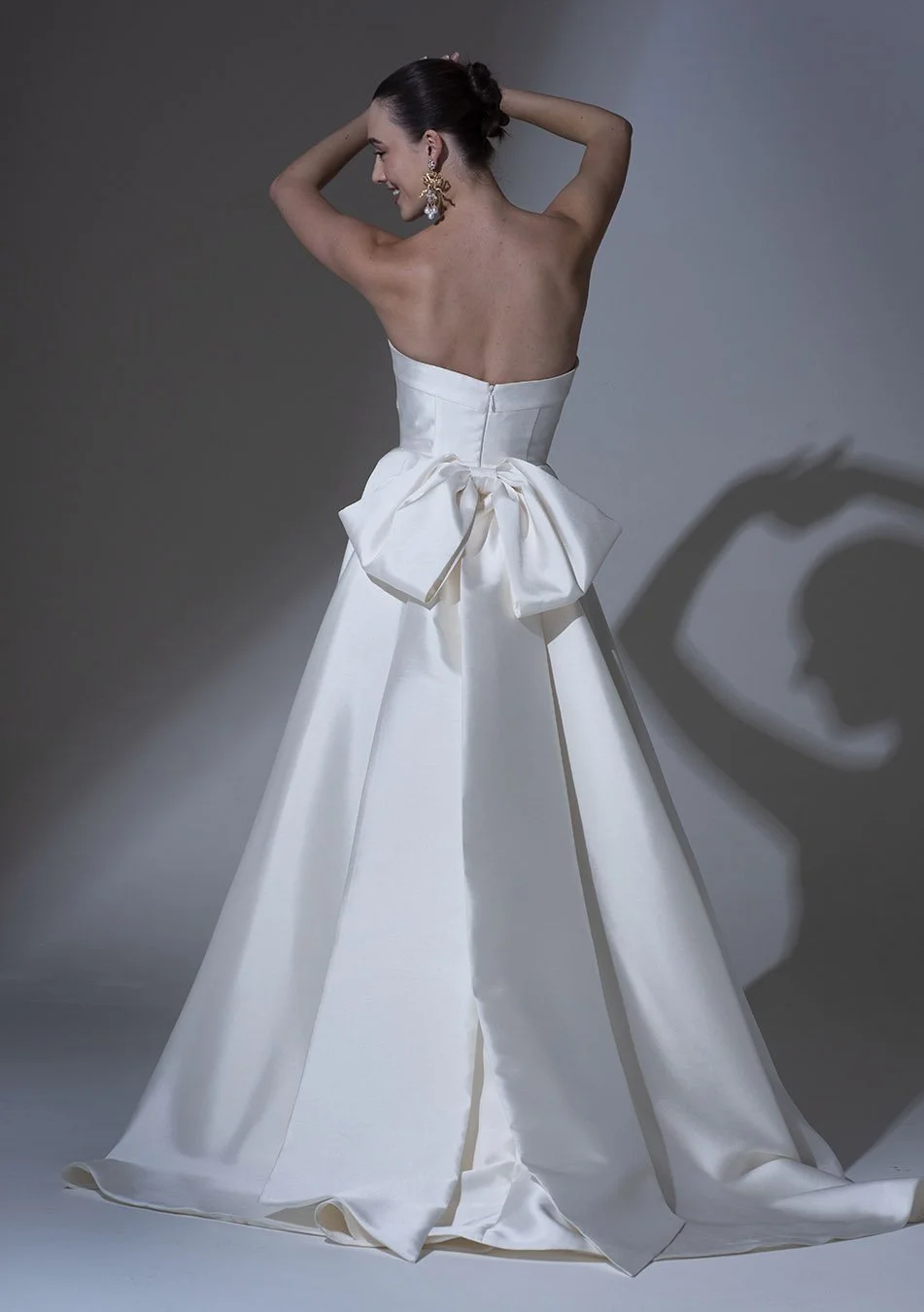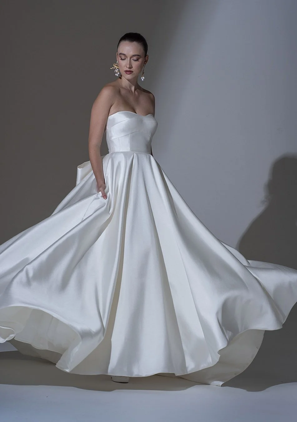 Classic strapless wedding gown with wonderful seam detail on the fitted bodice, Etta by Freda Bennet has a perfect oversized bow at the back for a whimsical touch. Full skirt with the essential pockets.