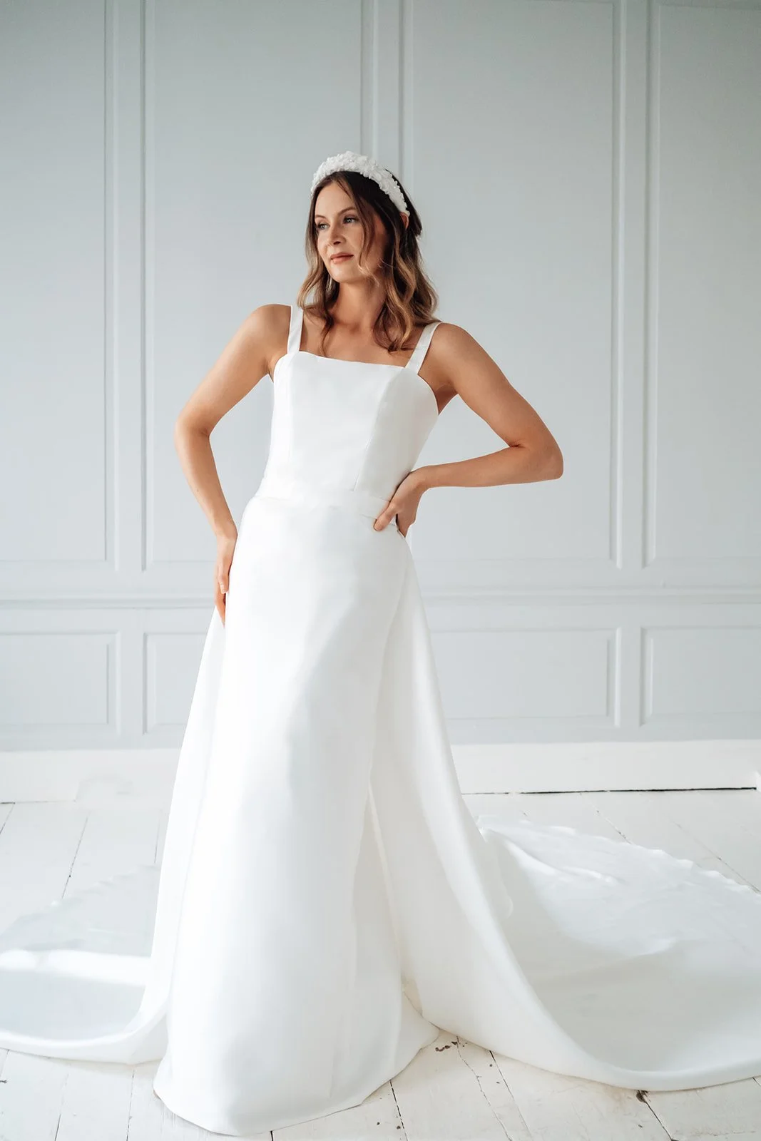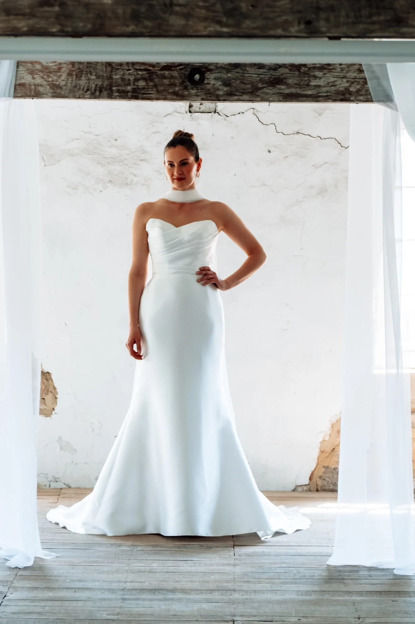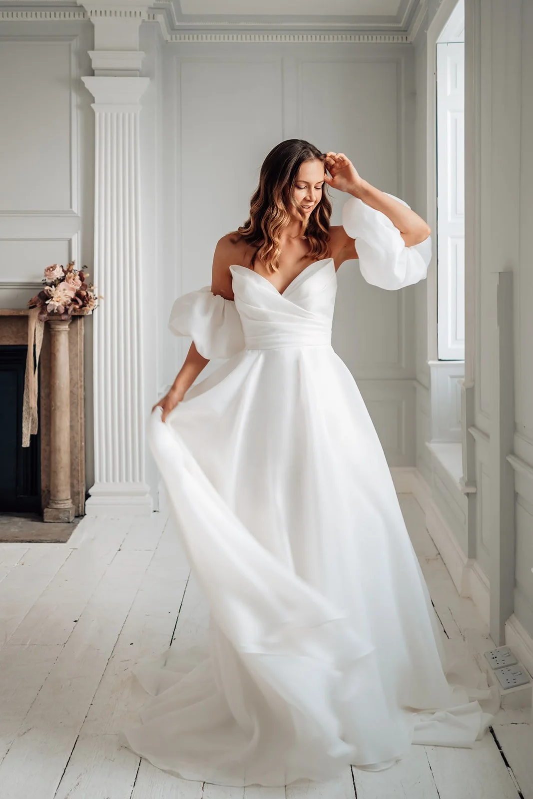 I feel both of the collections lend themselves to either country or town weddings, intimate or grand-scale, church or registry office. Accessorised with a lace- edge cathedral-length veil or a simple pearl hairband. That's something we can explore at your appointment or revisit later in an accessory appointment looking at veils, hair accessories and shoes.